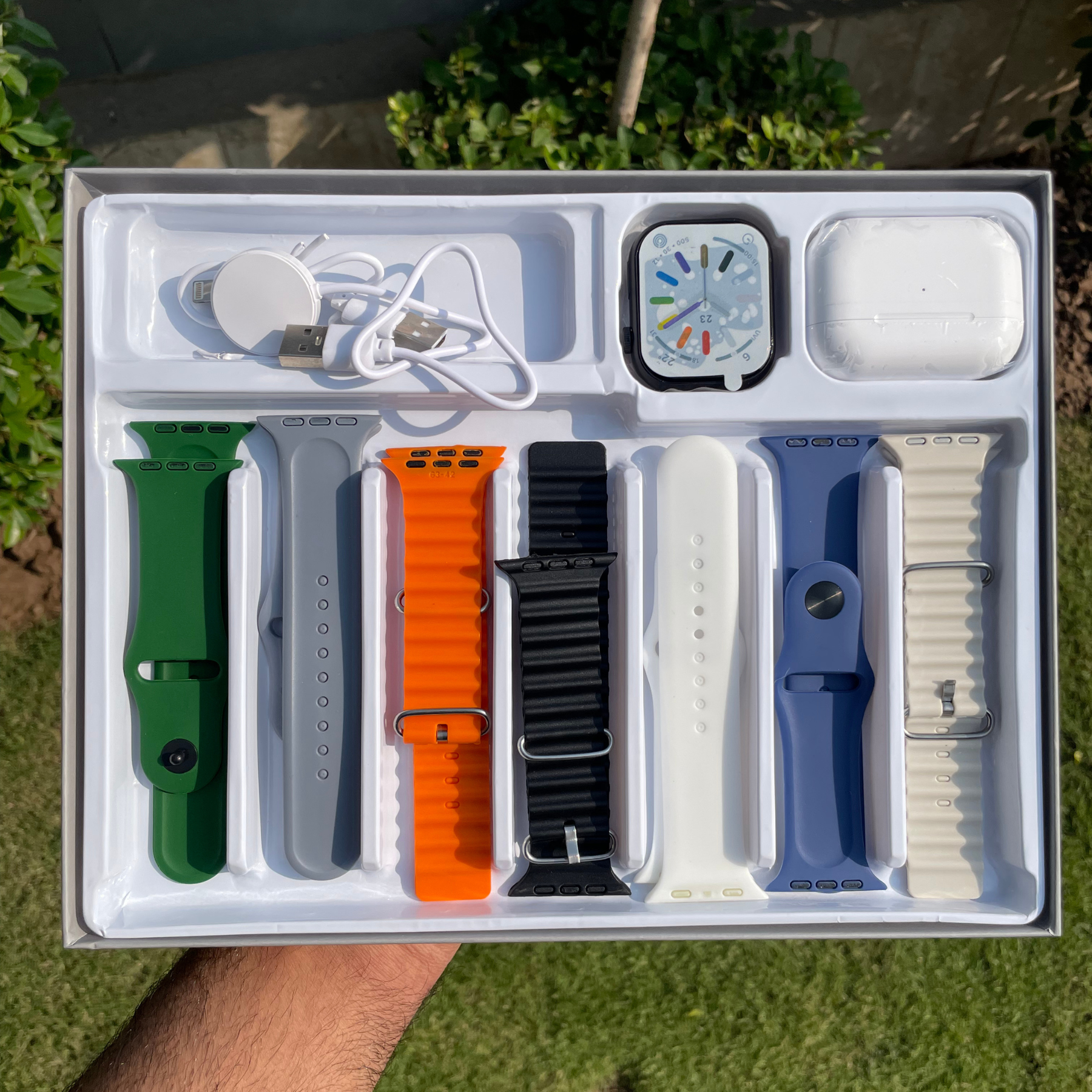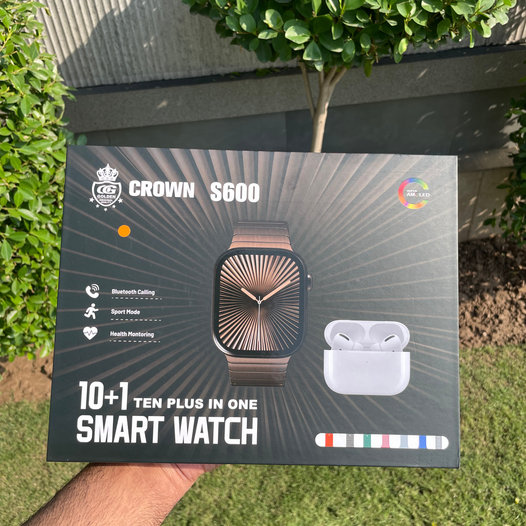 The Crown S600 is a premium 10-in-1 smartwatch featuring Bluetooth calling, AMOLED display, health tracking, and multiple sport modes. Comes with 7 interchangeable straps and wireless earbuds for a complete smart lifestyle combo.